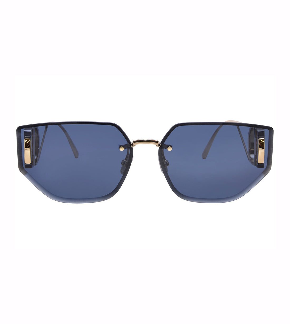 This sunglasses come in a gold metal and gold metal frame with blue lenses, a...