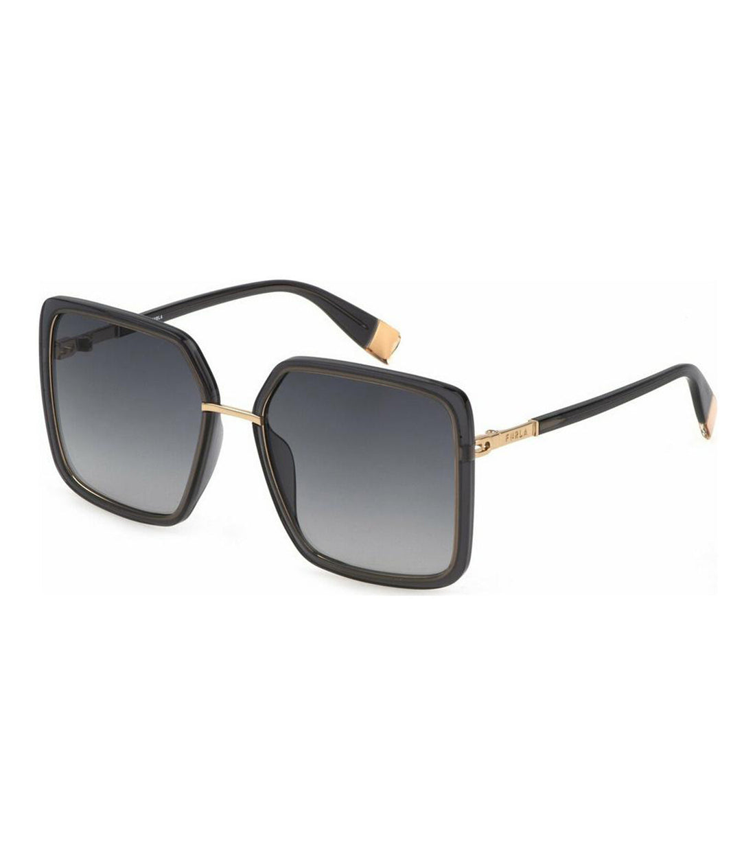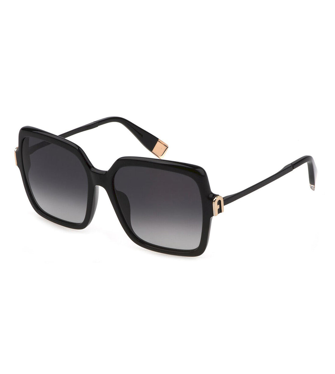 These Furla sunglasses come in a black plastic and black plastic frame with grey lenses,...