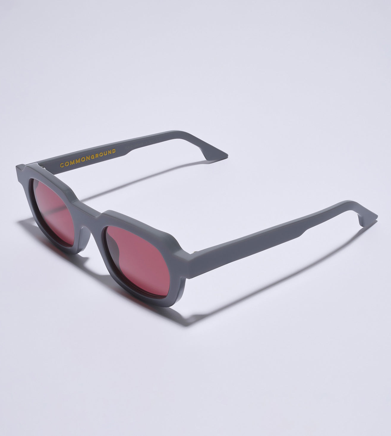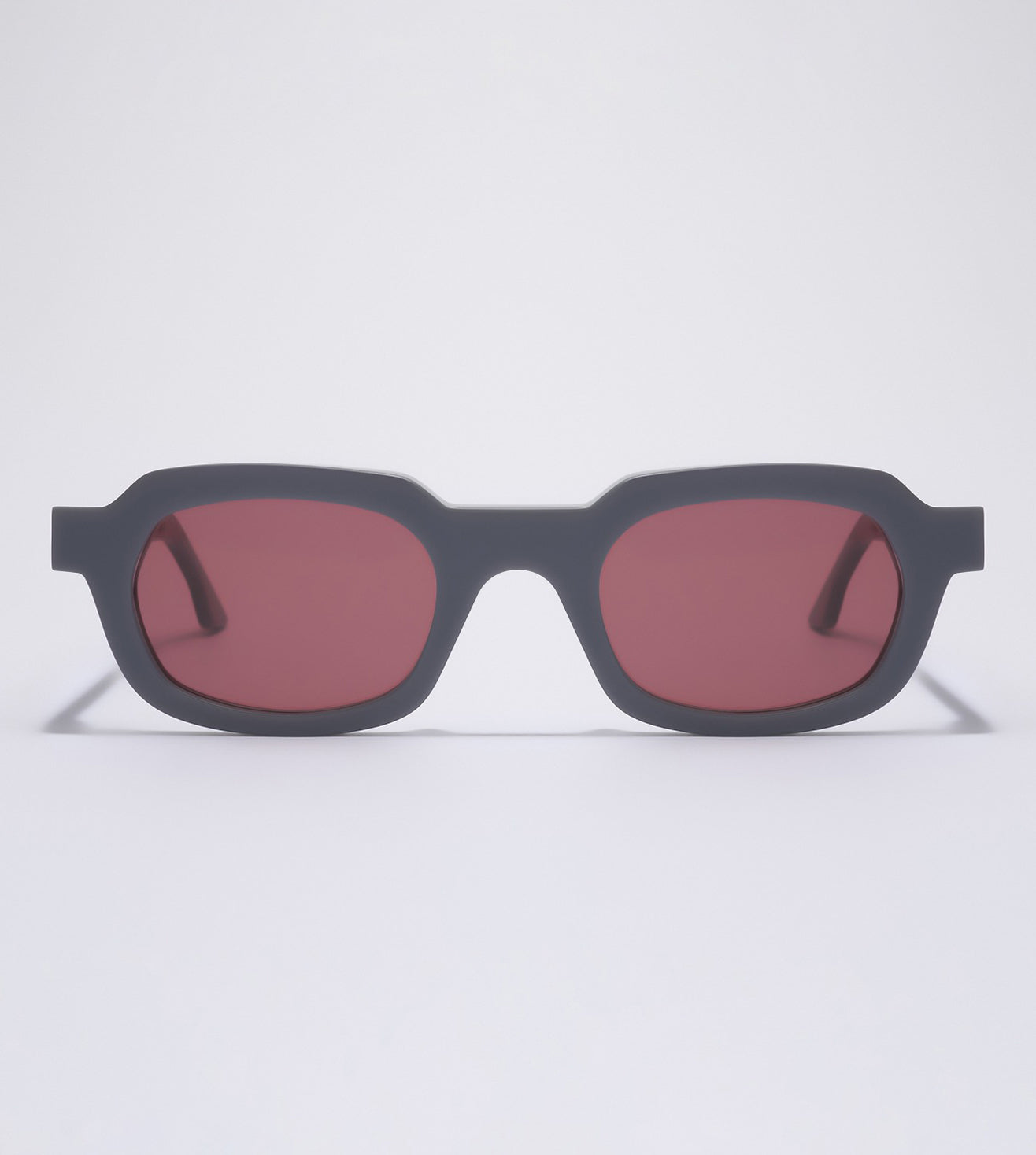 The THX model can be defined as a rectangular with rounded and sinuous lines, in contrast with the two small edges present in the upper part of the bridge. Thin and centered noses, in continuity with the thickness of the temples. Presented in pastel grey with red lenses |