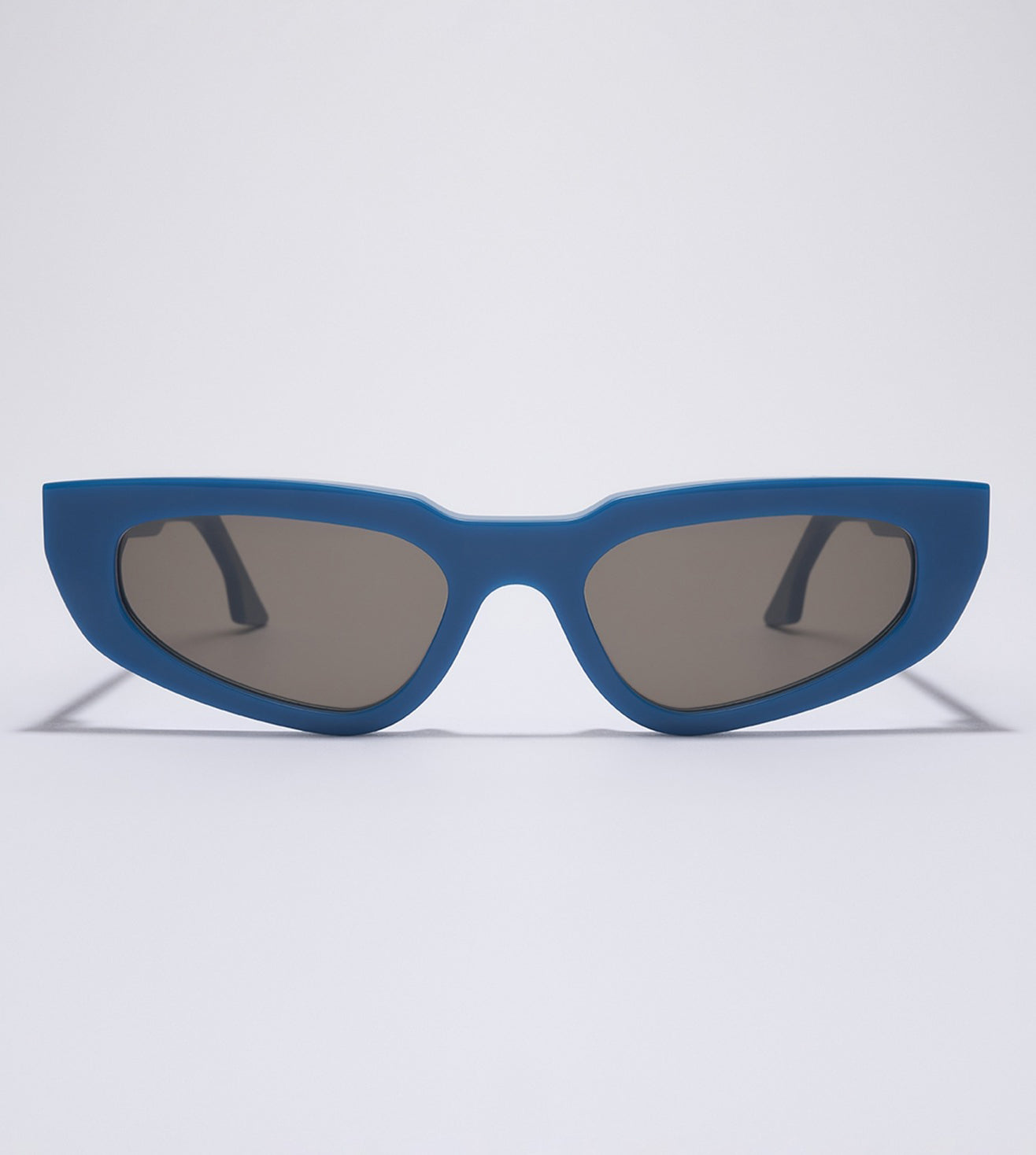 Modern cat-eye shape. In the RUOK model, the geometries of the front are enhanced by the use of different thicknesses, thinner near the bridge, more important in the noses, giving a bold and gritty appearance. Presented in blue with brown lenses. |