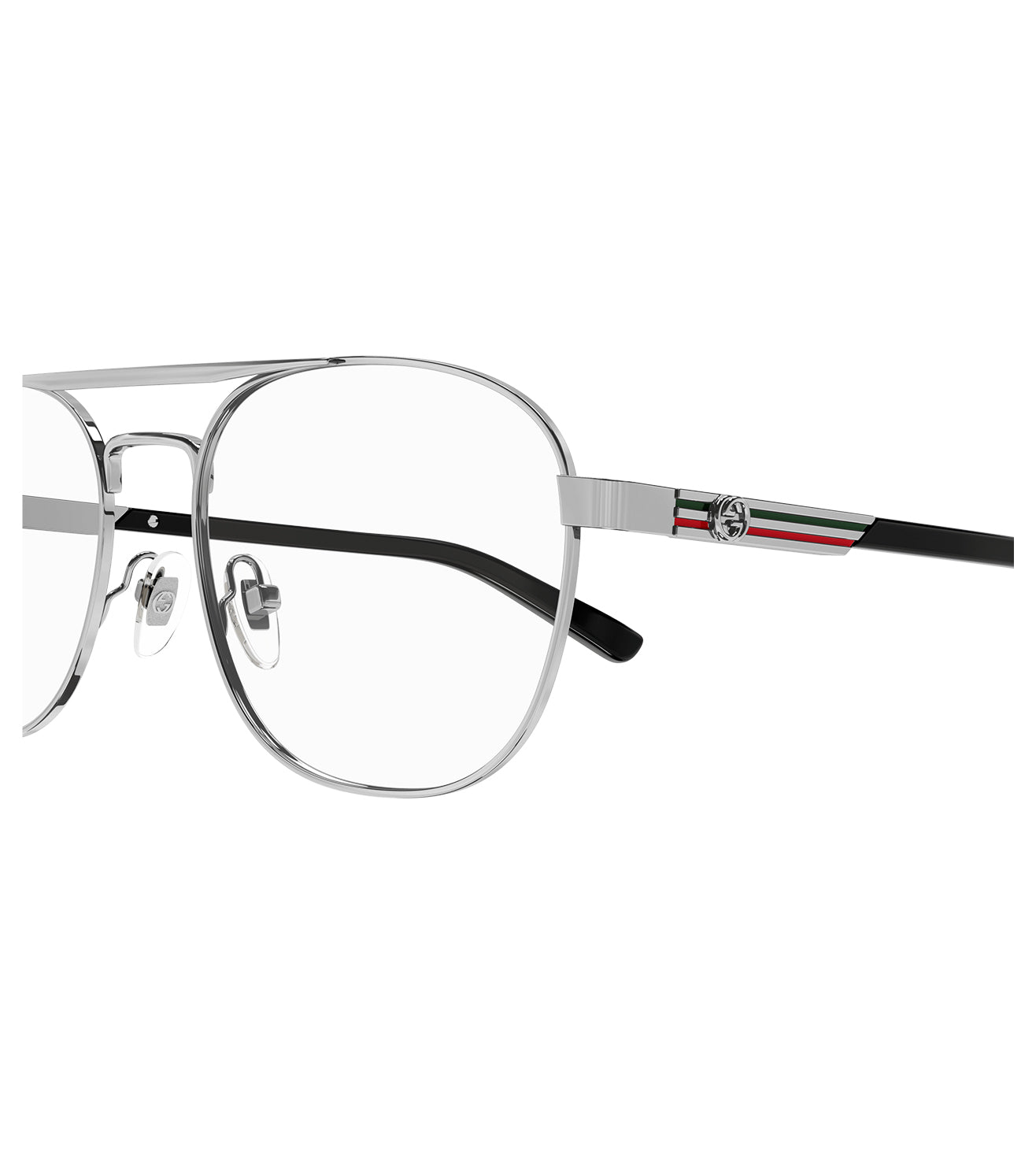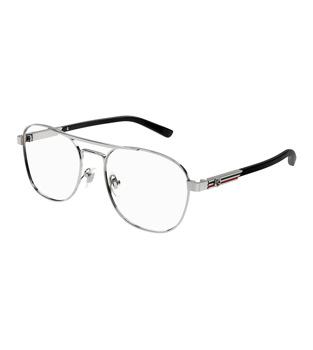 Founded in 1921, Gucci offers eclectic and contemporary creations that represent the pinnacle of Italian craftsmanship that are unsurpassed in quality, attention to detail, and imaginative design. Vintage inspired pilot shape. GG Interlocking logo on both temples. Enameled stripes recalling the web on both temples. Vintage style with a contemporary fit.