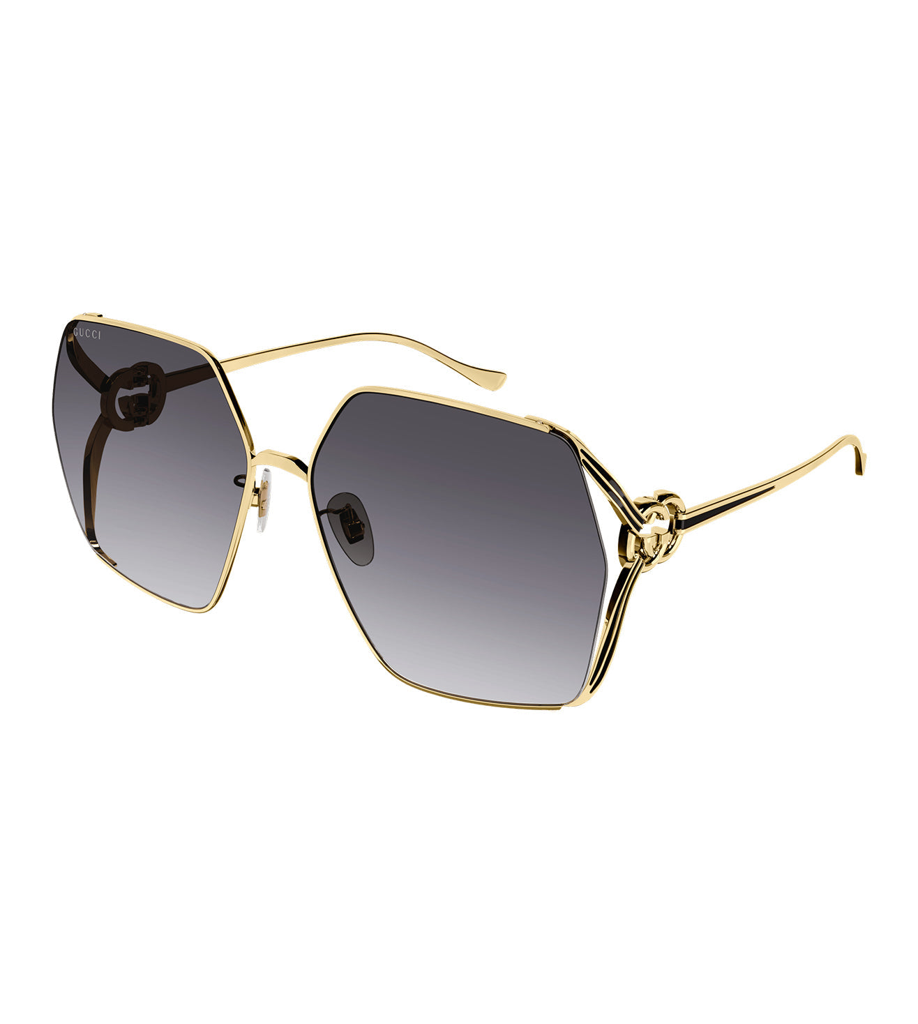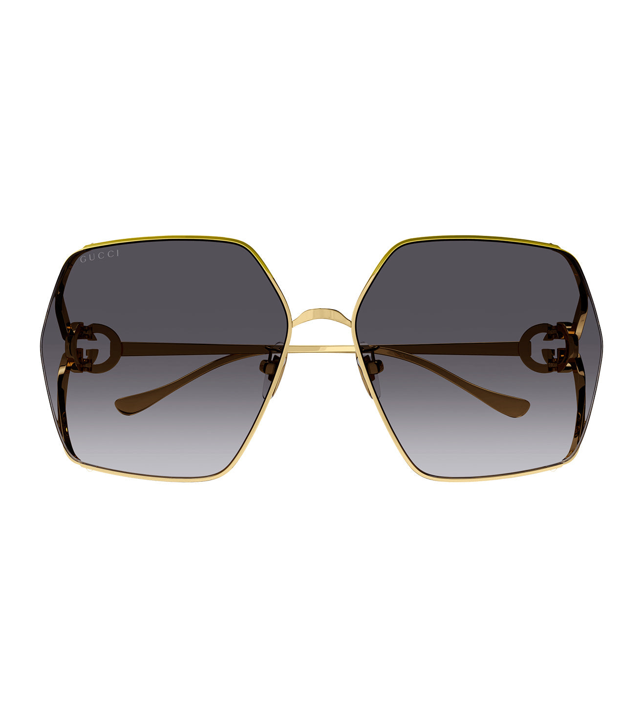 Founded in 1921, GUCCI offers eclectic and contemporary creations that represent the pinnacle of Italian craftsmanship, unsurpassed in quality, attention to detail, and imaginative design. Vintage oversized squared shape. Enameled detail on temples recalling the web. Functional GG Interlocking logo serving as an integrated hinge. Brand new Fork interpretation. Customized with the signature brand details, this eyewear comes in its original branded case with a complementary cleaning cloth.